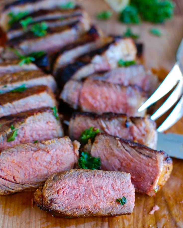 - Remove the steak and let it rest on a cutting board for 5 minutes, then slice against the grain.